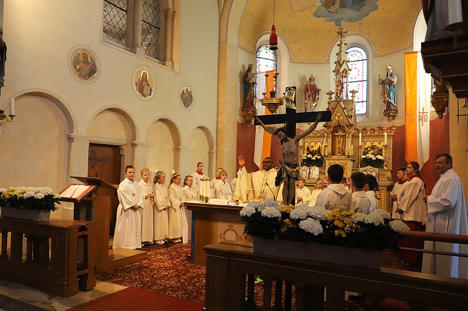 Zusammen mit Pfarrer Emmanuel Okoro und Gemeindereferent Markus Seefeld (PG Schwarzenfeld-Stulln), der die Kinder auf ihrem Weg vorbereitet hatte, feierten sie ihre Erstkommunion in der St. Ulrich Kirche in Kemnath bei Fuhrn. Die musikalische Gestaltung des Festgottesdienstes übernahm die Schola Kemnath unter der Leitung von Gabi Lehminger.
